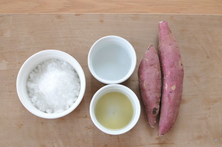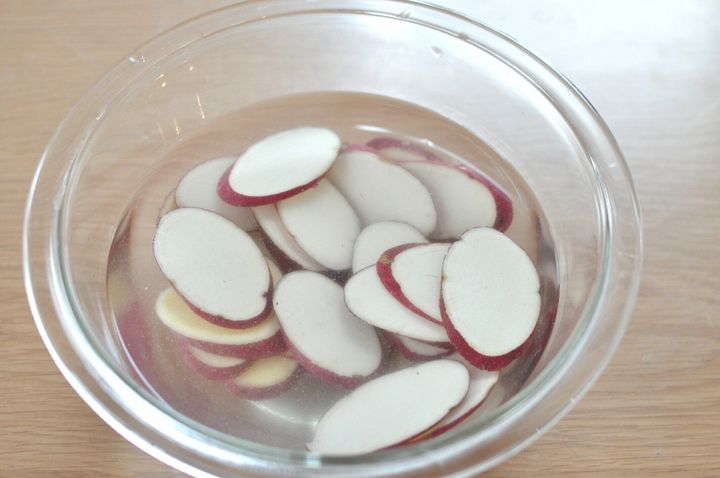 今回は細いさつまいもだったので、斜めにカットしました。太いさつまいもは、普通の輪切りでOKです。