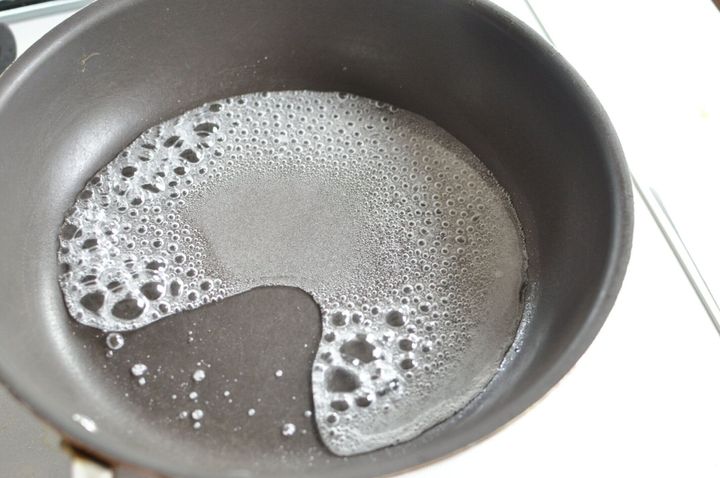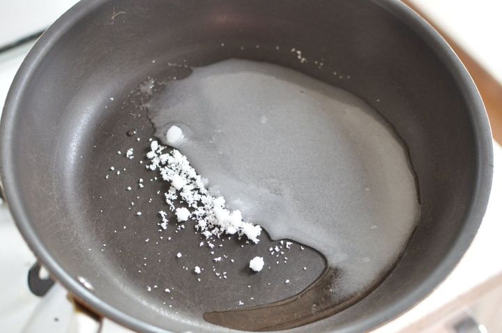 別のフライパン(同じフライパンの油を切って使い回しももちろんOK)に、砂糖と水を入れて火にかけます。