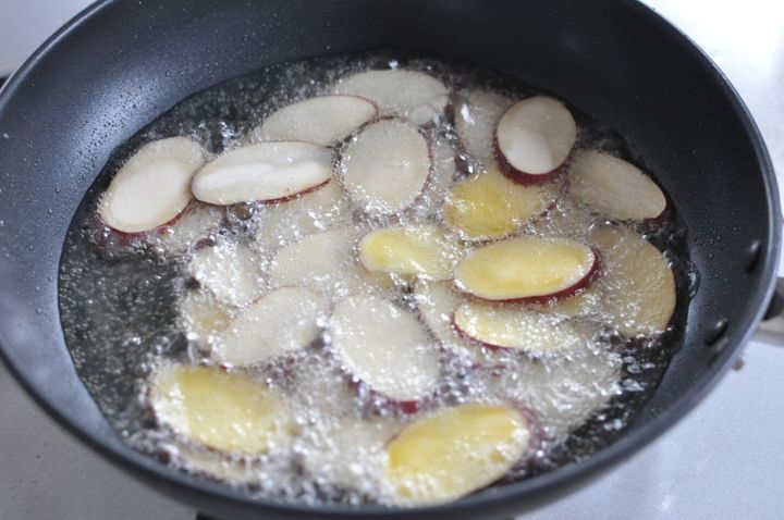 薄いスライスなので、油が少なくてもカリッと揚がります。