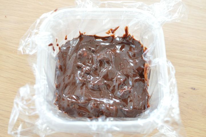 ラップを敷いたタッパーに、チョコレートを1/3量入れて平らに広げます。