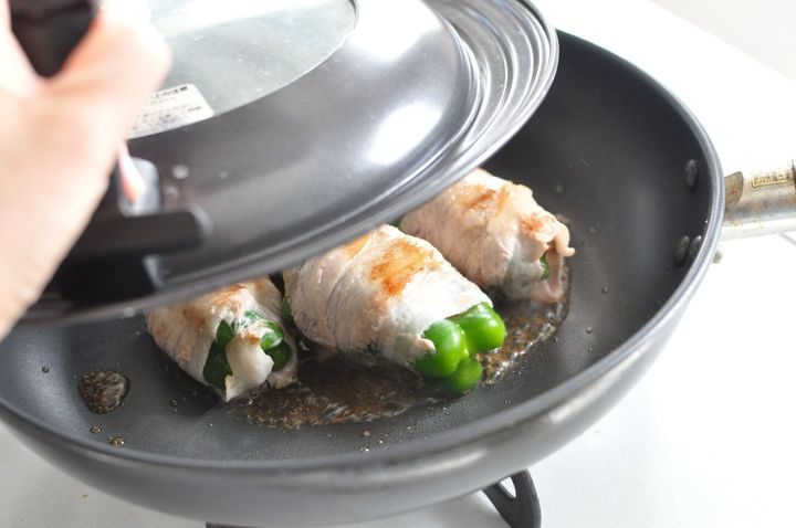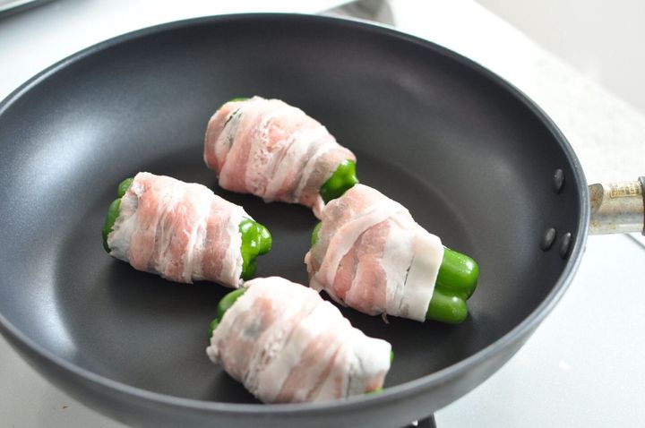 フライパンにピーマンを並べます。巻き終わりを下にして、中火で火をつけ、全面こんがり焼き色がつくまで時々転がしながら焼きます。