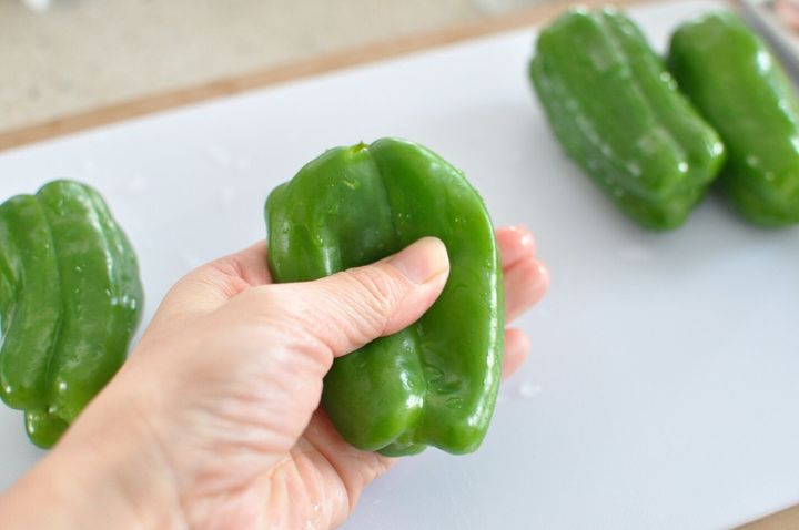 ピーマンは洗って、手でギュッとつぶします。バリバリっと割れ目が入るようにつぶしてください。