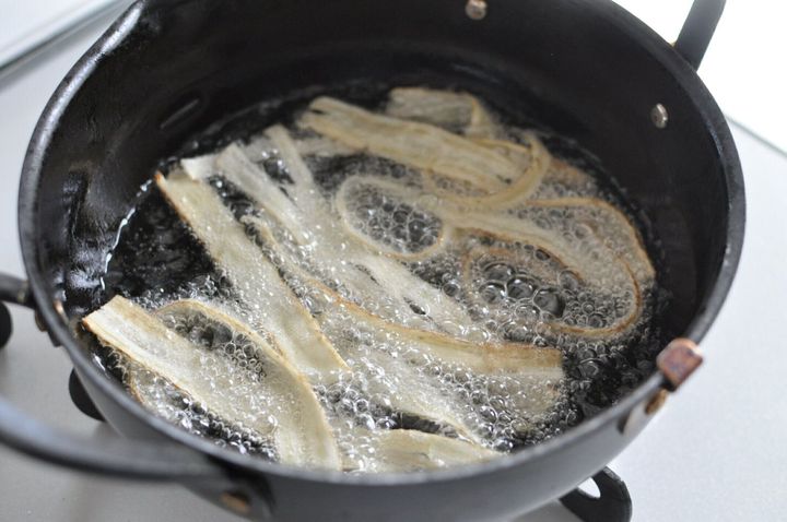 ごぼうの水気をキッチンペーパーでしっかり拭き取ります。160~170℃に温めた油で、1分程揚げます。