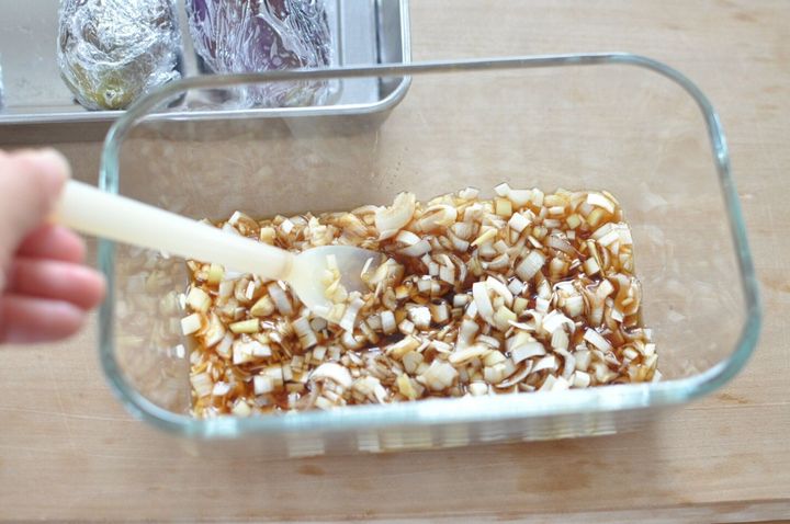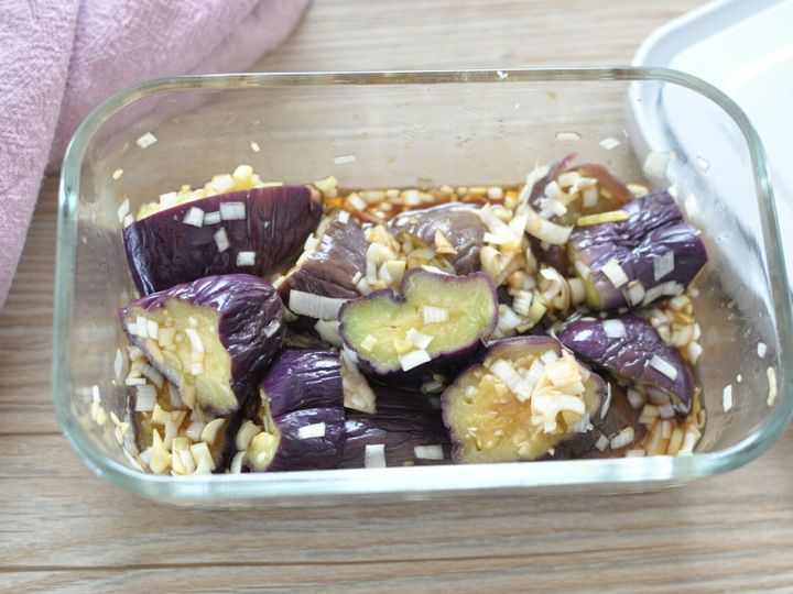 その場合、香味ダレの長ねぎと生姜は、少なくとも2~3分はタレと馴染ませておきたいので、なすをレンジで加熱する前にタレを作っておくことをおすすめします。