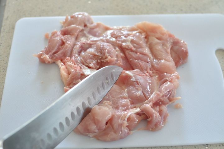 レンジでムラなく火を通すために、均一の厚みになるよう開くか、難しければ厚みのある個所に切り込みを入れます。