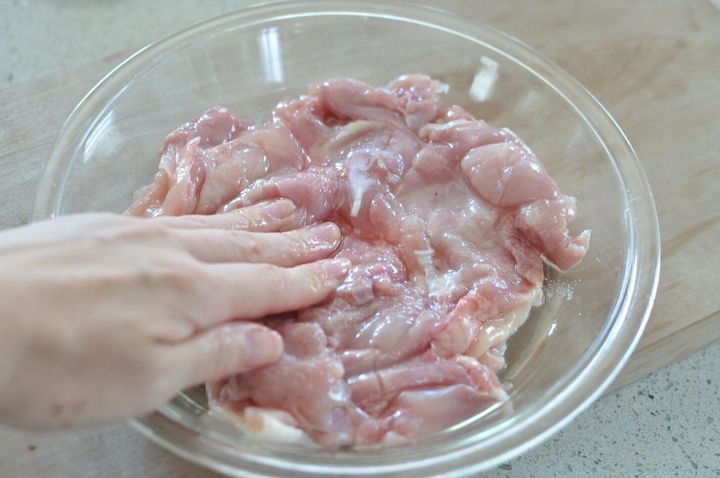 鶏肉を耐熱皿に入れ、砂糖・酒・塩をもみ込みます。調味料が全体に馴染むよう、しっかりもみ込むとよいです。