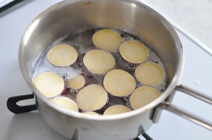鍋の大きさは、さつまいもが並ぶ大きさがベスト。しっかり煮汁が行きわたるよう、さつまいも同士隙間なく並ぶような、小さめの鍋を選ぶとよいです。