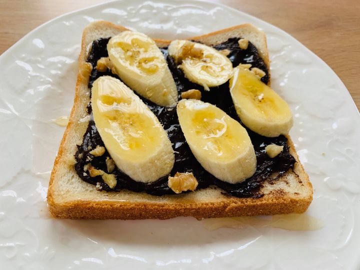 トーストした食パンにチョコクリームを塗って、バナナと蜂蜜、砕いたナッツなどをのせます。