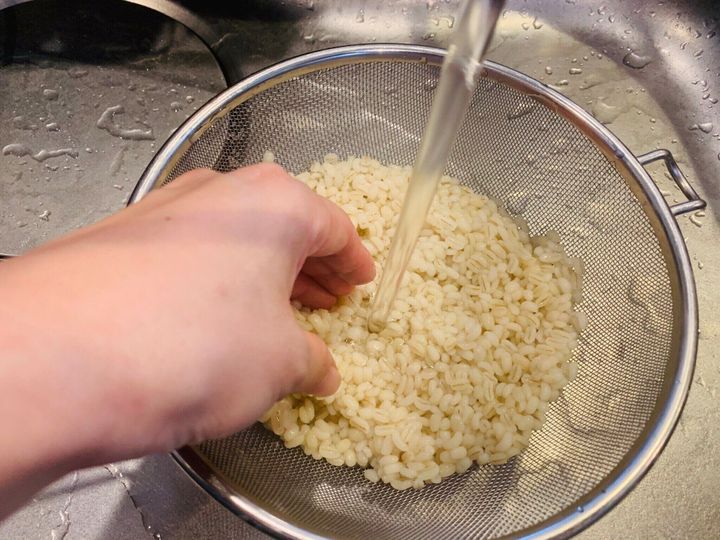 2.好みの固さに茹でたら、水で洗ってぬめりを落とす