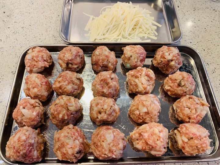 3、20個分に成形します。皮はできるだけ細長く切り、肉ダネにギュッと付けます。