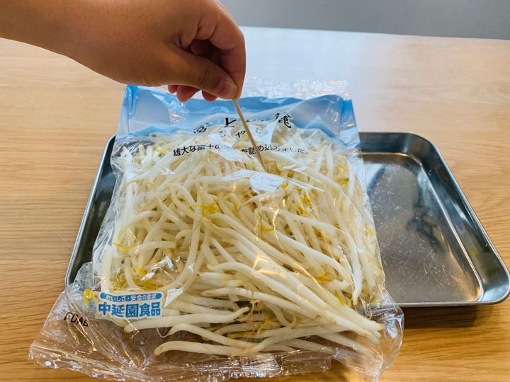 そこで、買ってきたもやしを冷蔵庫に入れる前に袋に穴をあける!たったこれだけで、水分が袋から逃げてくれるので、少し日持ちが良くなります。