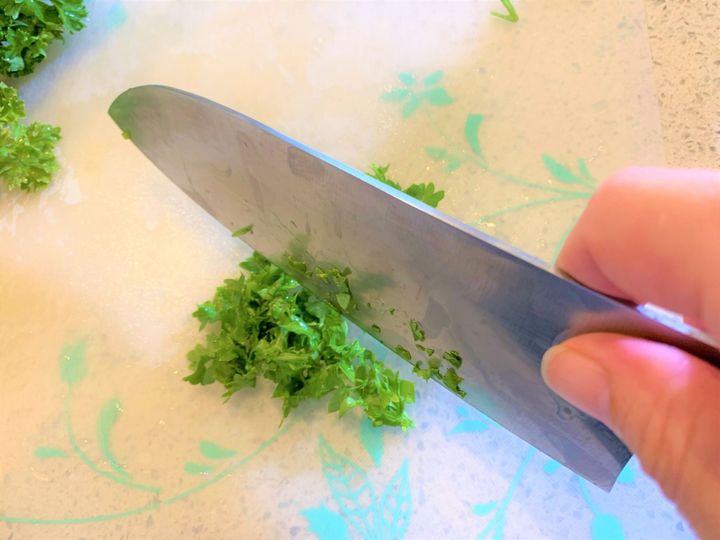 パセリの葉を茎から外して方法でみじん切りにします。ここが今回一番めんどくさい作業。難しくはないけれど、ちょっと面倒。なので疲れていない時にするのが良いと思います。
