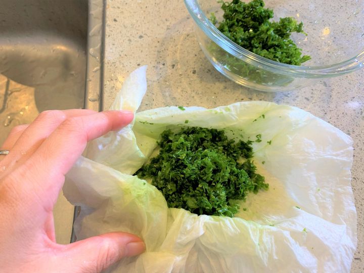キッチンペーパーを二重にして、刻んだパセリを包みます。