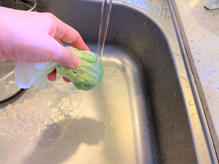 流水でササっと3~4秒洗って、ギュッと絞ります。ここで洗いすぎると色が落ちてしまうので要注意。また力いっぱい絞るとペーパーが切れるので、優しくキュキュッと絞ります。