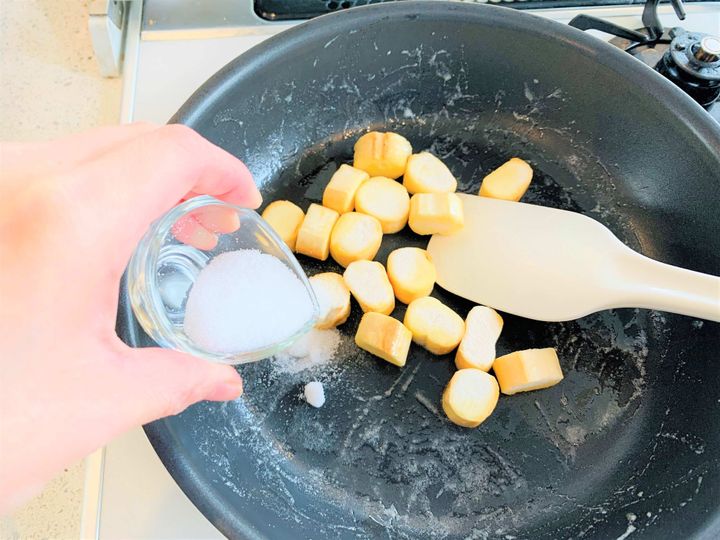 4.グラニュー糖が全体に混ざったら火をつけて、弱火で混ぜながらキャラメル状になるまで混ぜます。