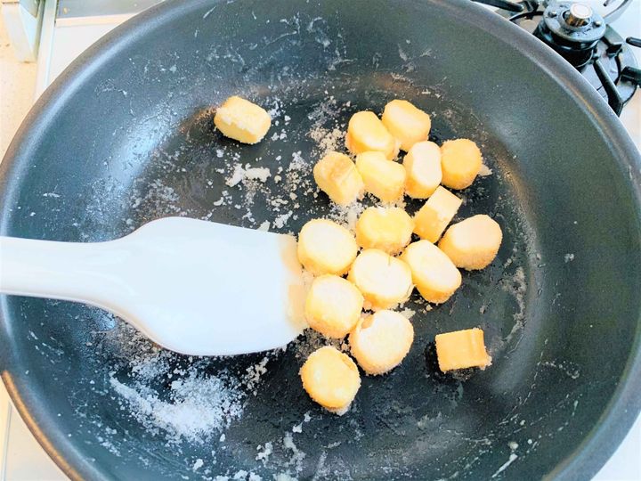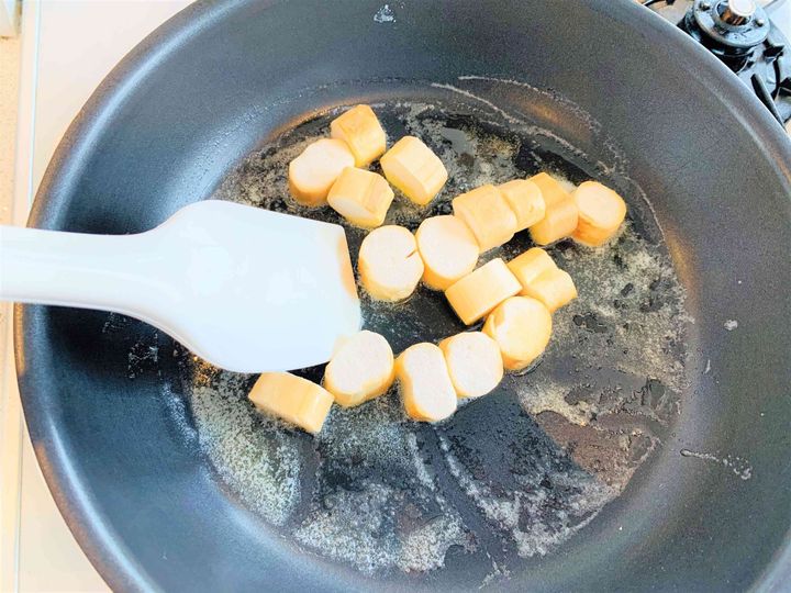 2.バターが完全に溶けたら、お麩を入れてバターをしっかり絡ませます。