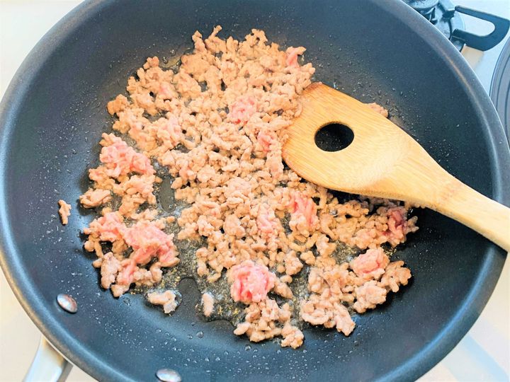 3.フライパンでひき肉を炒めます。(なすをレンチンする前にひき肉を炒めておくのも良いです。)
