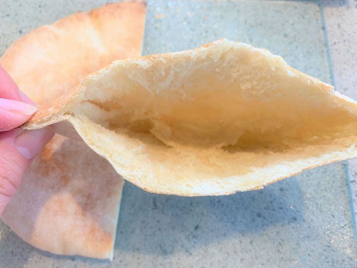 焼いたピタパンを半分にカットすると、こんな風にポケット状に開くことができます。