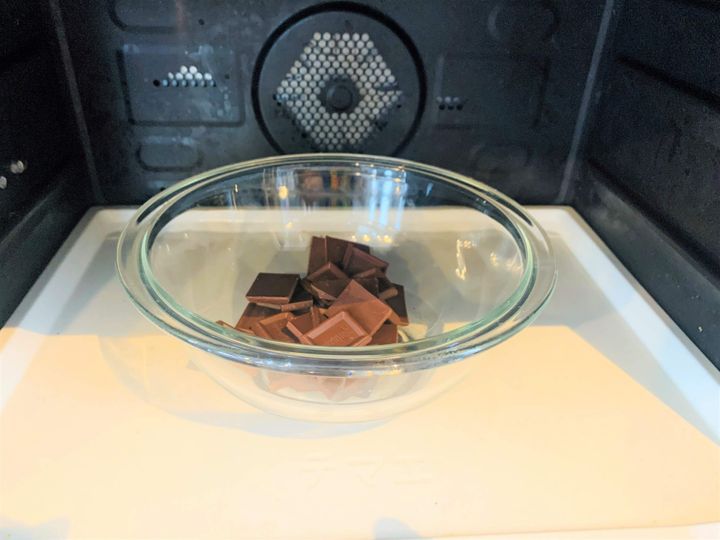 板チョコを割ってボウルにいれ、レンジで加熱して溶かします。
