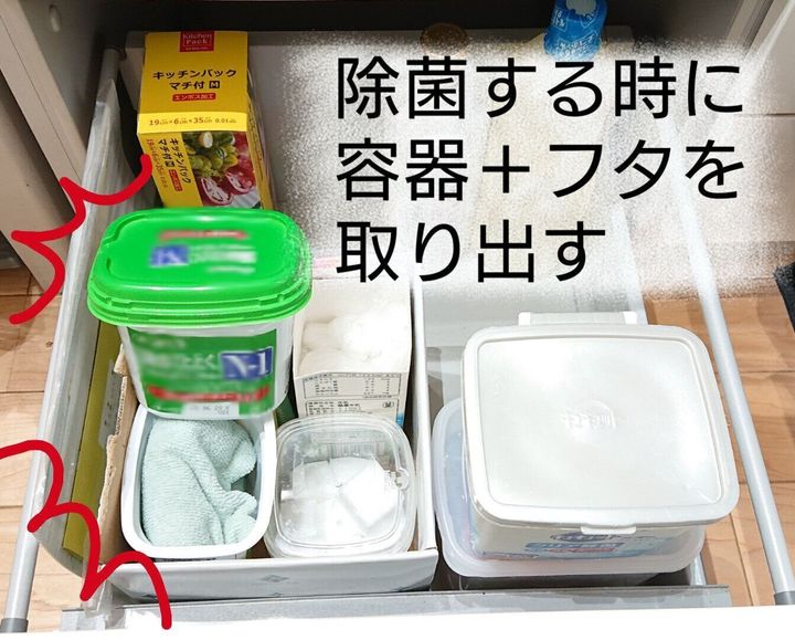 このヨーグルト容器のお陰で、物を増やさずに毎日漂白除菌することが可能になりました。