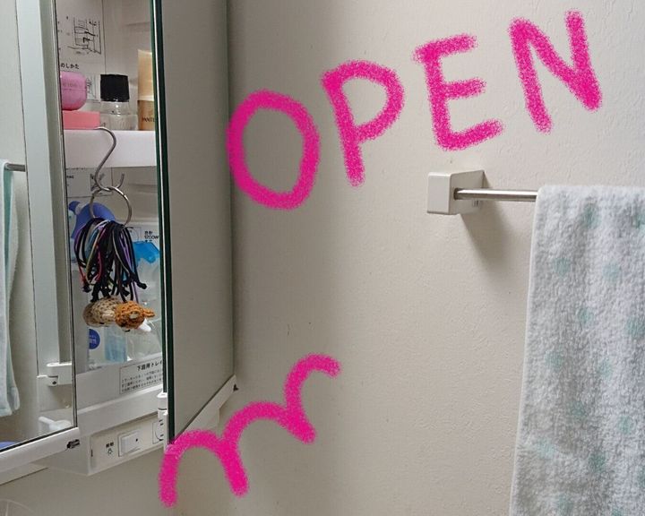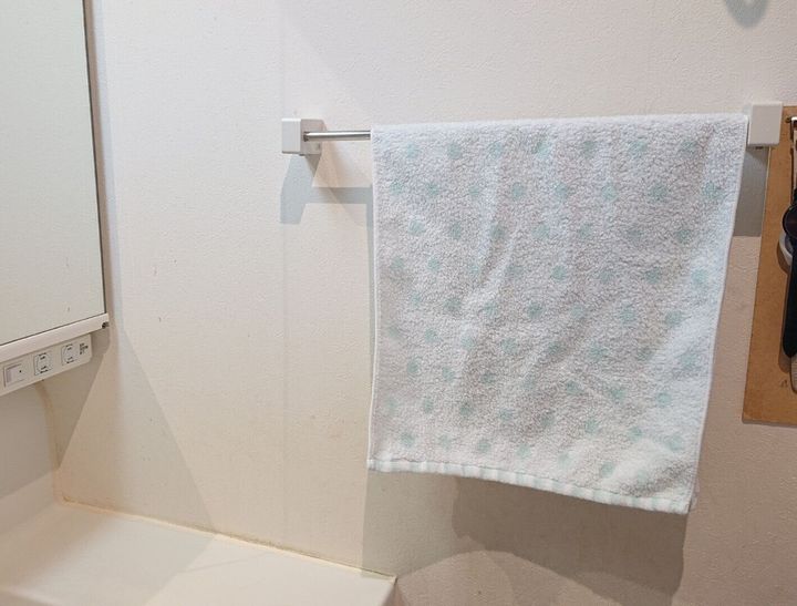 使う時(朝)と片づける時(夜)はタオルバーに、それ以外の時はヒッソリと鏡面裏に引っ掛けて隠しているのでスッキリです。