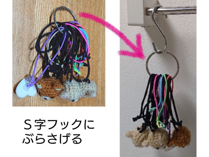カードリングにヘアゴムを通して、そのリングをS字フックに引っ掛けるだけです。