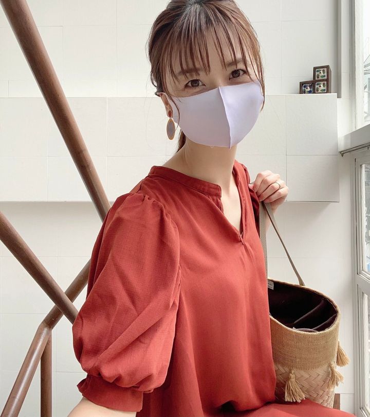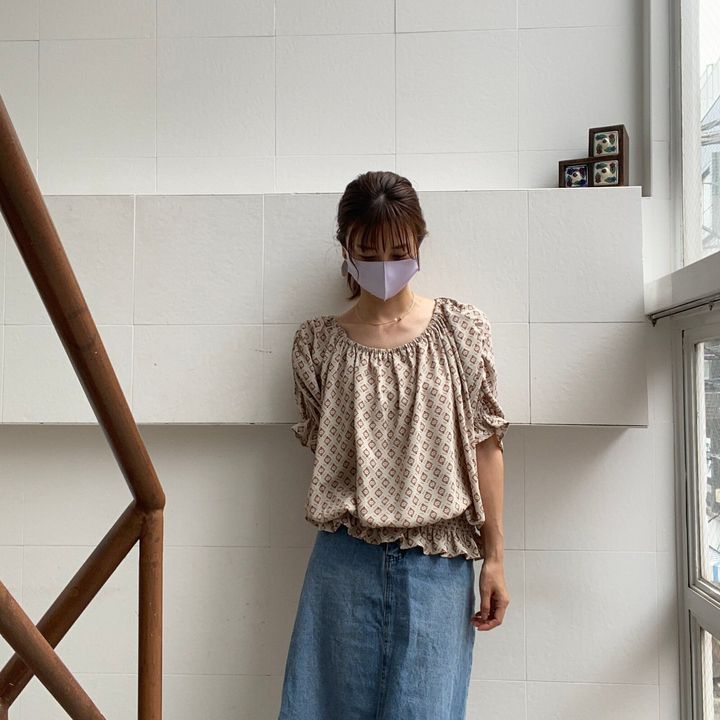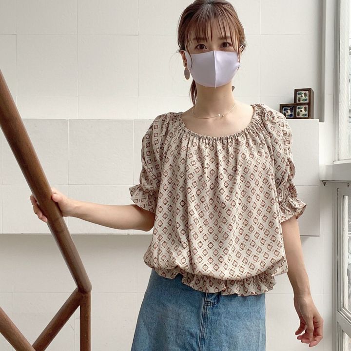 ちょっと可愛くなりがちなシャーリングの効いたブラウスは