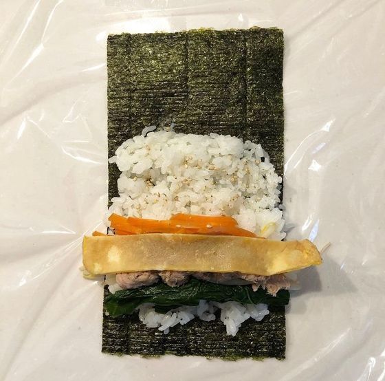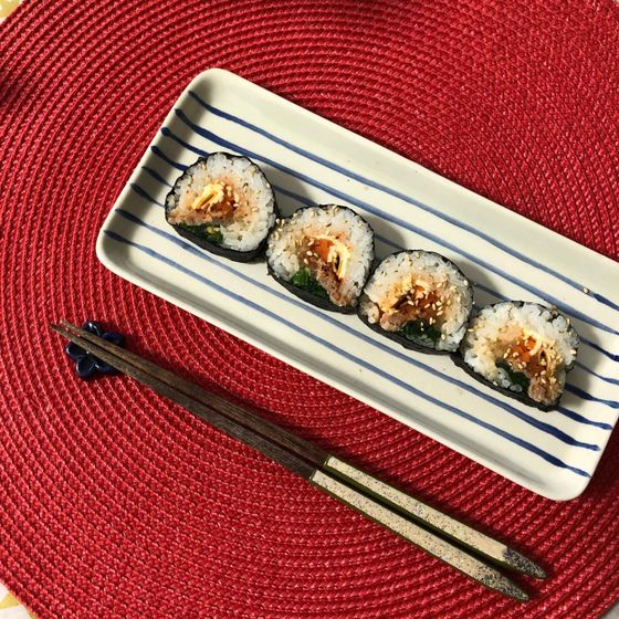 韓国風の海苔巻きで、韓国料理店などでも人気の一品です。