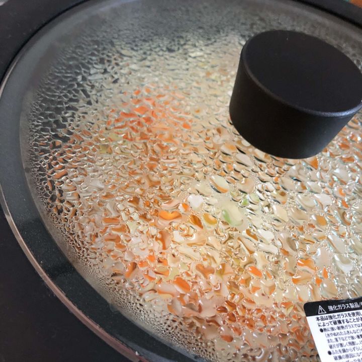 ③ 大さじ2~3の水を加えたら、蓋をして【弱火】で玉ねぎがしんなりするまで加熱する。(約10分くらい)