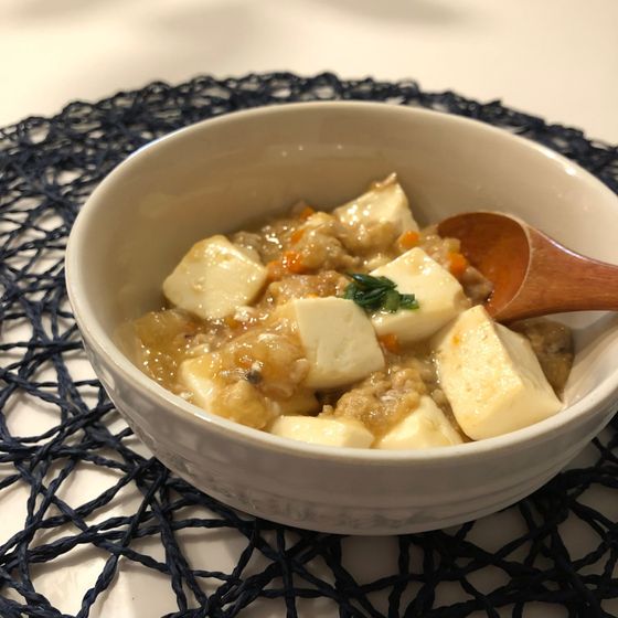 絹豆腐、味噌、豆板醤、ごま油をプラスして、お家で簡単麻婆豆腐の完成♩