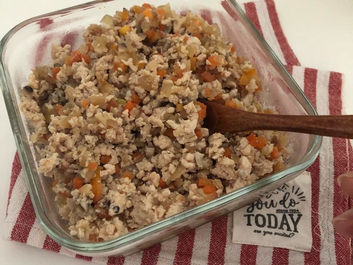 鶏野菜そぼろなら、しっかり火が通っているので、あとはプラスする食材の火が通っていればOK♪