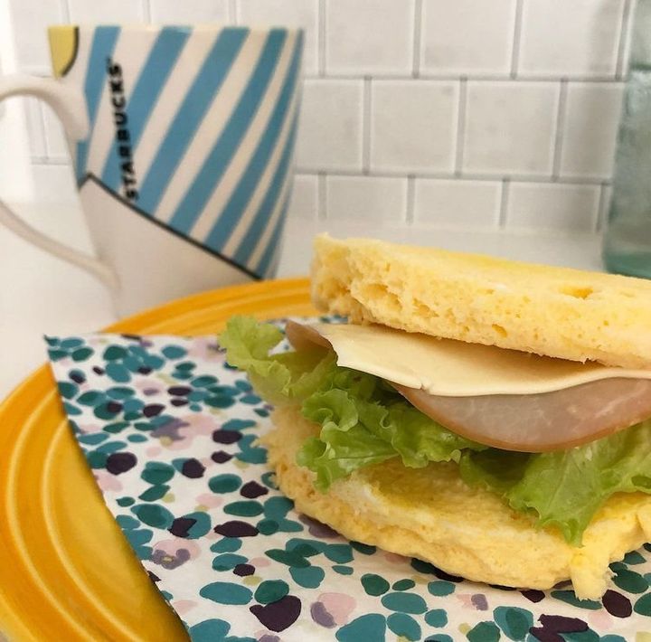 出来上がったふわふわレンジケーキを2枚にカットし、好きな具材を挟めば立派な食事です◎