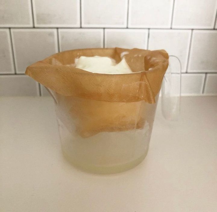 私は、計量カップにコーヒー用のフィルターを付け、その中にヨーグルトを入れて一晩寝かせ作っています。