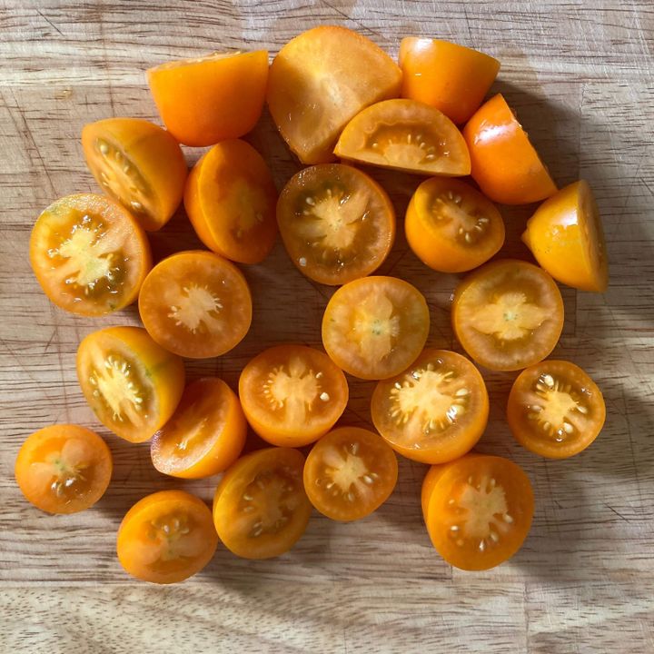 1、ミニトマトのヘタを取り、半分に切ります。