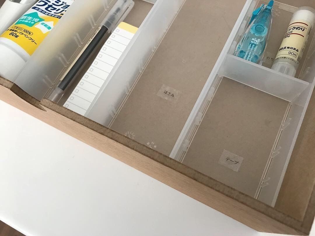 はさみやテープは子供もよく使うので、ケースにわかりやすいようにラベリングしてあります。ラベリングのおかげで子供もきちんと定位置にお片付けしてくれるので、「あれがない!これがない!」ということがなくなりました。