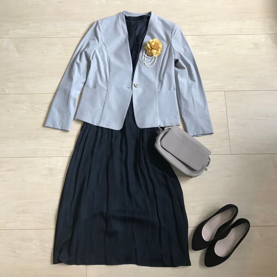 ▼ネイビーのワンピースにライトグレーのジャケットを合わせました。
