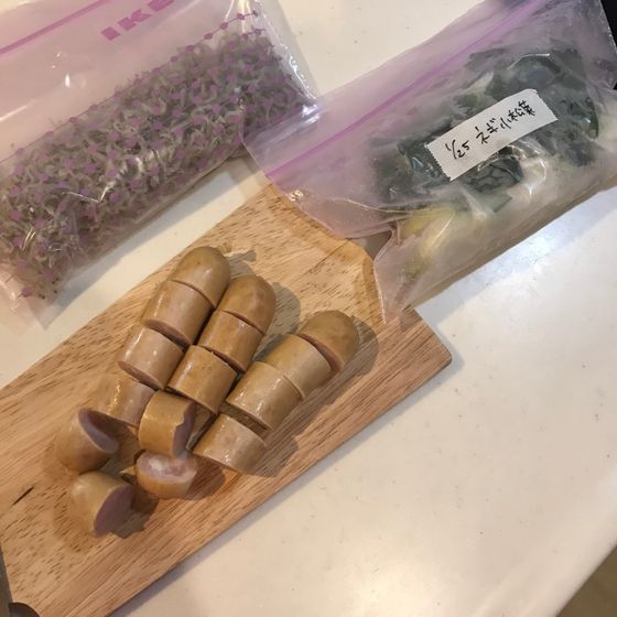 半端な野菜の切れ端を残すくらいなら・・・と汁物用に切って小分け冷凍しておくだけで、とても便利に使える、小分け冷凍野菜。自家製味噌汁ミックスのような感覚で使っています。