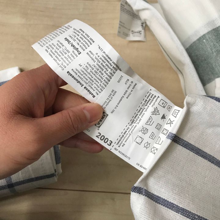 以前は筆者もこのタグがついたまま使っていたんですが、なんか…邪魔だなぁと感じませんか?必要な表示が書かれているとはいえ、多言語で書かれていることもあって長さも量も普通のタグとはけた違いですよね。