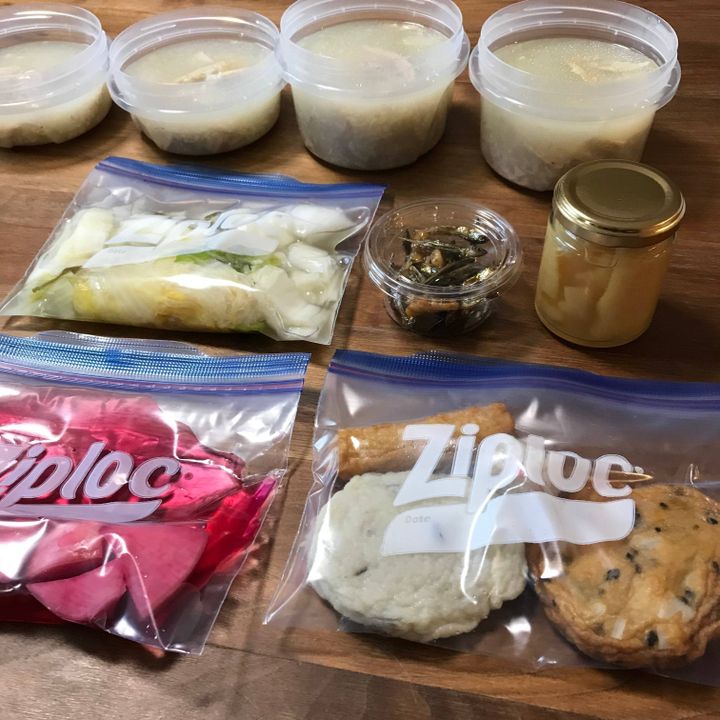 お漬物や田作り、夫の好物の数の子、あとはおでんに入れ損ねた練り物(笑)画像奥の保存容器にはたっぷり仕込んだサムゲタンを入れて、すべてまとめて保冷バッグに入れて持っていってもらいました。