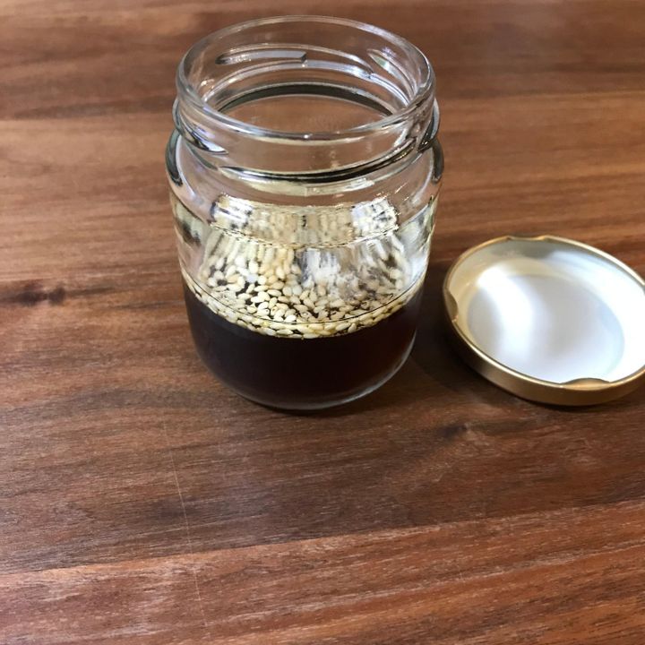 めんつゆとすし酢を1:1で瓶にいれ、ごま油をちょろり。ニンニクと白ごまもお好みの量入れます。目分量で大丈夫です。