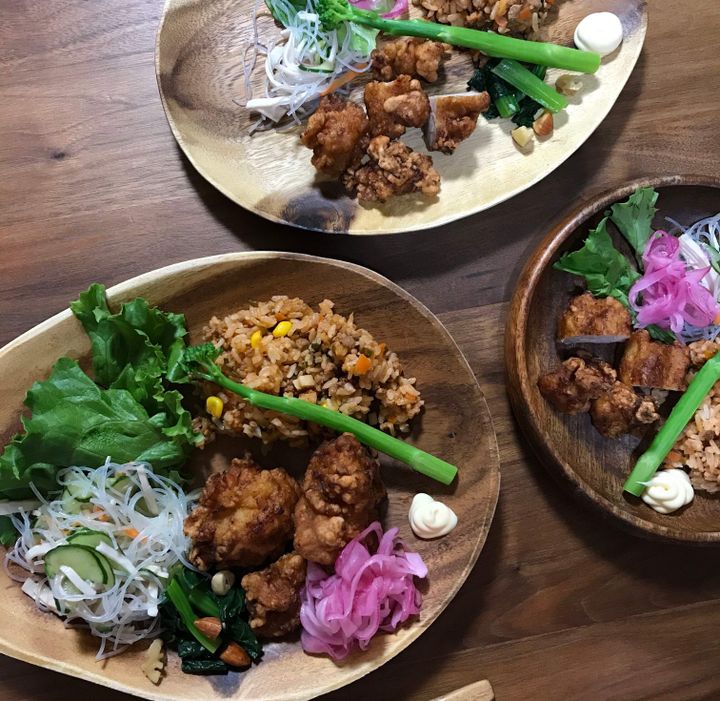 ▼唐揚げとケチャップライス、小松菜のナッツあえ