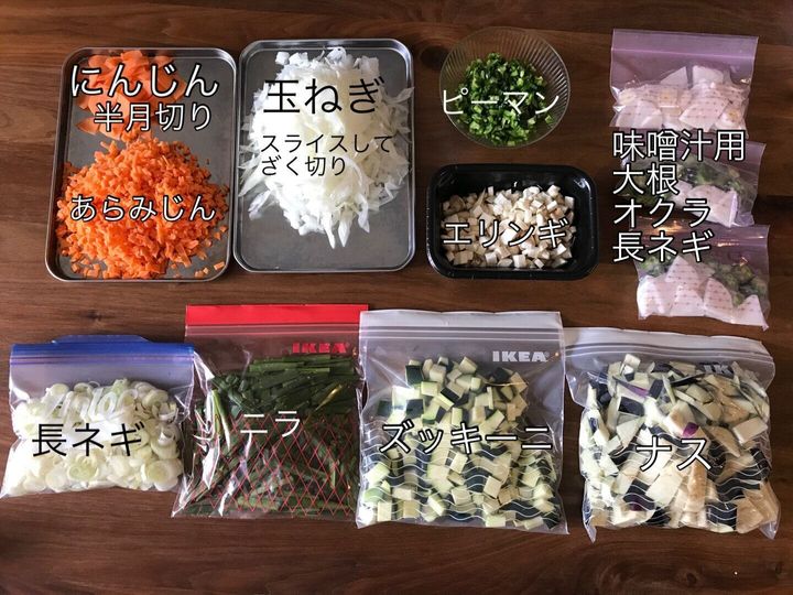 これらに加えてピーマン、エリンギはキーマカレーにもケチャップライスにも使用するので、それぞれに振り分けて袋に入れました。使う日まで冷凍室で待機してもらいます。