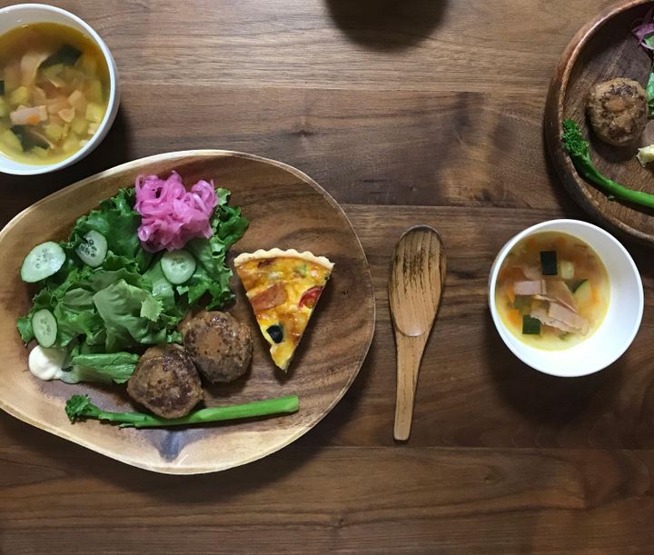 野菜スープの野菜には、ケチャップライスを作った時の余りと同じく冷凍していたズッキーニを少し使って作りました。とてもラクだったのに、オシャレ風な食卓になってご満悦な筆者です。このハンバーグはおから入りで作ったもので、やわらかくて栄養も◎お弁当にも入れたりするので小さめでたくさん作ってありました。