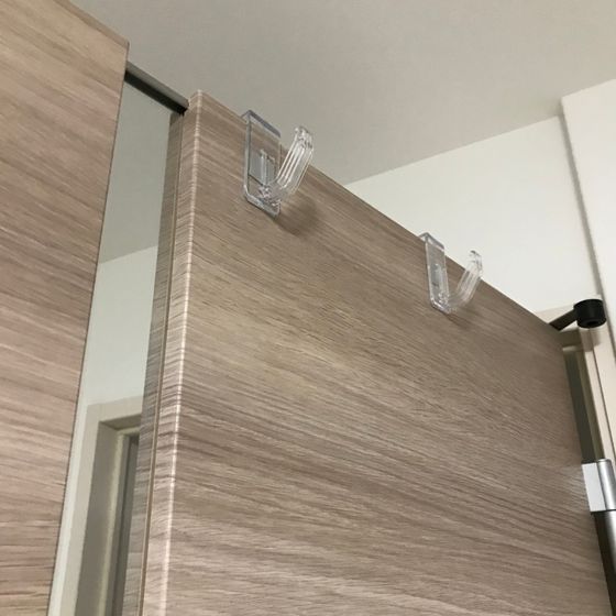 棚にフックを取り付ける場所がなかったり、棚に手を加えるのに抵抗がある場合はドアフックもオススメ。