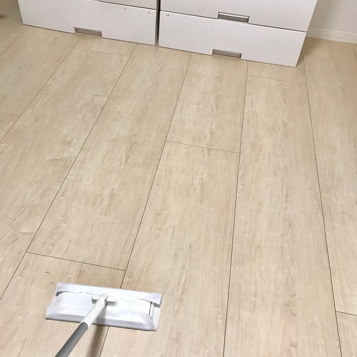 フローリングモップでスーイスイ。ソファの下ってほんとうにホコリがたまりやすくて、1日に何度もモップかけをすることもありました。それを思うと本当に快適になったなぁ…と掃除するたびに感じます。