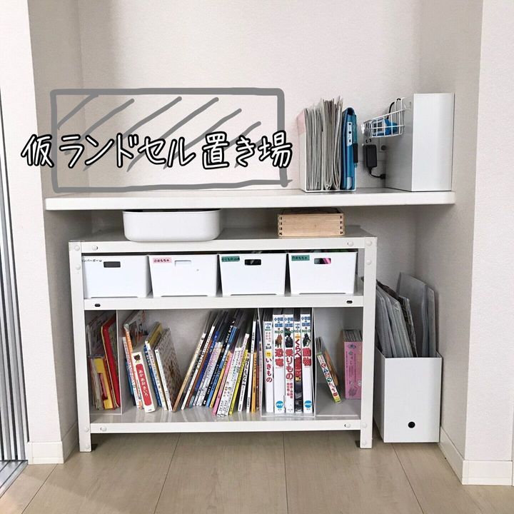 しばらく通学してから収納は考えようと思い、このようにおもちゃスペースの一角の空きスペースを仮のランドセル置き場にしていました。教科書も入学式で配布された分を確認してから家にあるファイルボックスを拝借してとりあえず様子を見ることに。