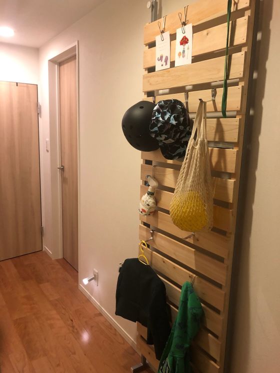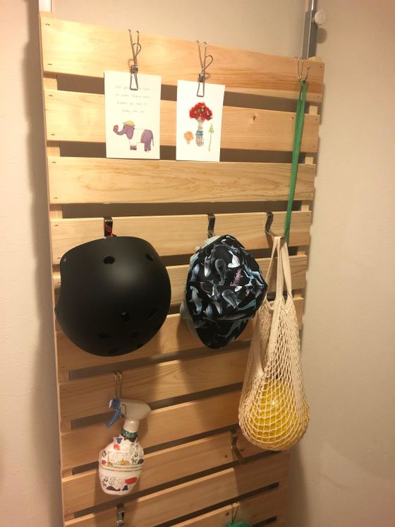 息子の外遊び用品や、幼稚園関連のものがかけられ、高さ的にも息子が自分で洋服をハンガーにかけられます。また、なくしがちな保護者証などもここにかけておくことで、「あれどこ行った」がなくなります。
