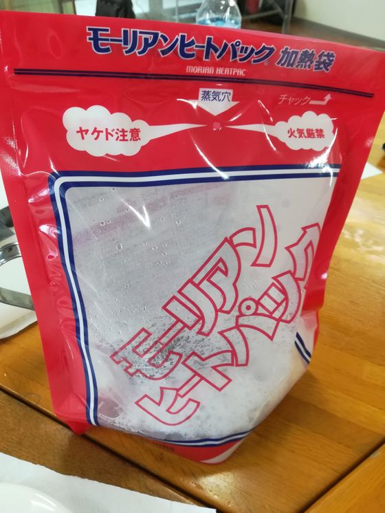 レトルトのパスタソースは、この、水を入れると発熱する「モーリアンヒートパック」を使って温めました。