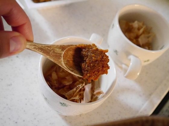 カップにたっぷりひとつかみのかつおぶしと、小さじ一杯のお味噌を入れて…お湯を注ぐだけ!