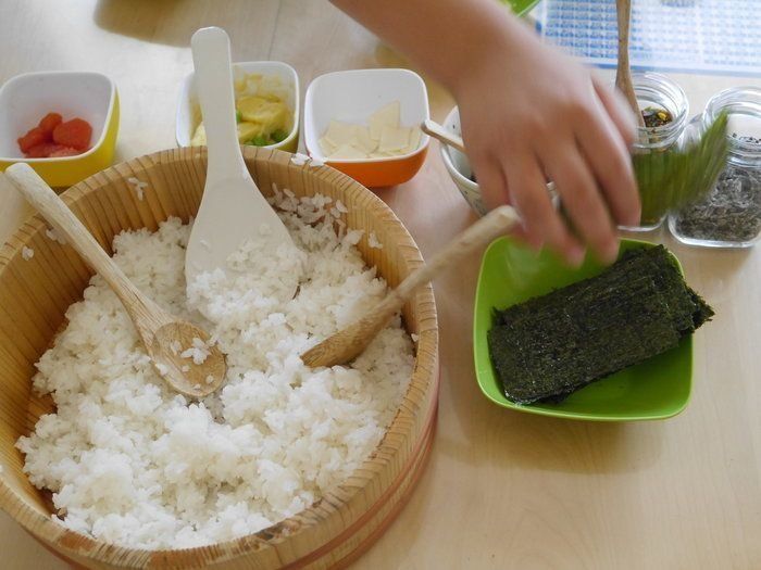自分たちで作るおにぎりは、子どもたち曰く「サイコー!」だそうです(笑)ウインナーやチーズなど変わり種の具にチャレンジしたり、いろいろたくさん具を入れて超ゴージャスなおにぎりにしたり、工作感覚ですごく楽しんでます。
